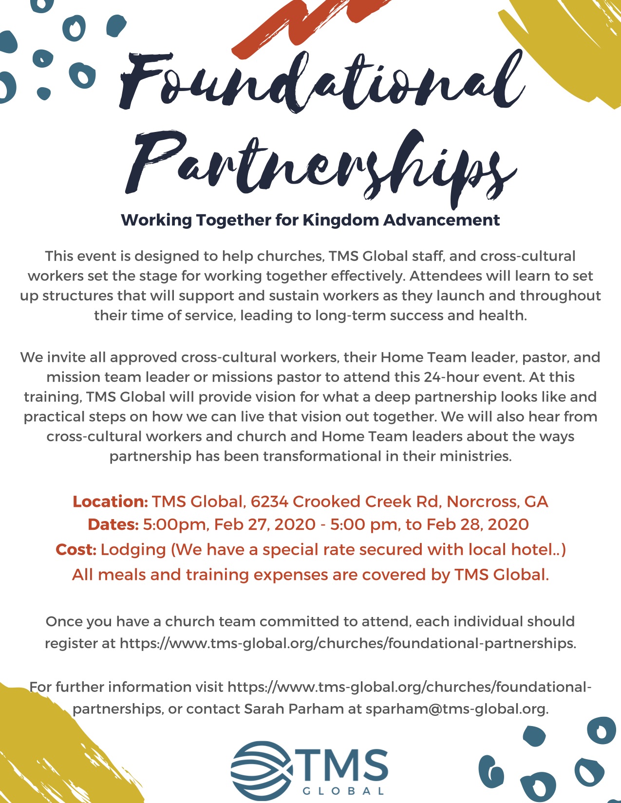 Participants are responsible for lodging expenses and arrangements. TMS Global has reserved rooms at the Hampton Inn at a discounted rate of $84/night + taxes. Be sure to ask for the "Foundations Two" rate with TMS Global. Or use this link to book your room.
